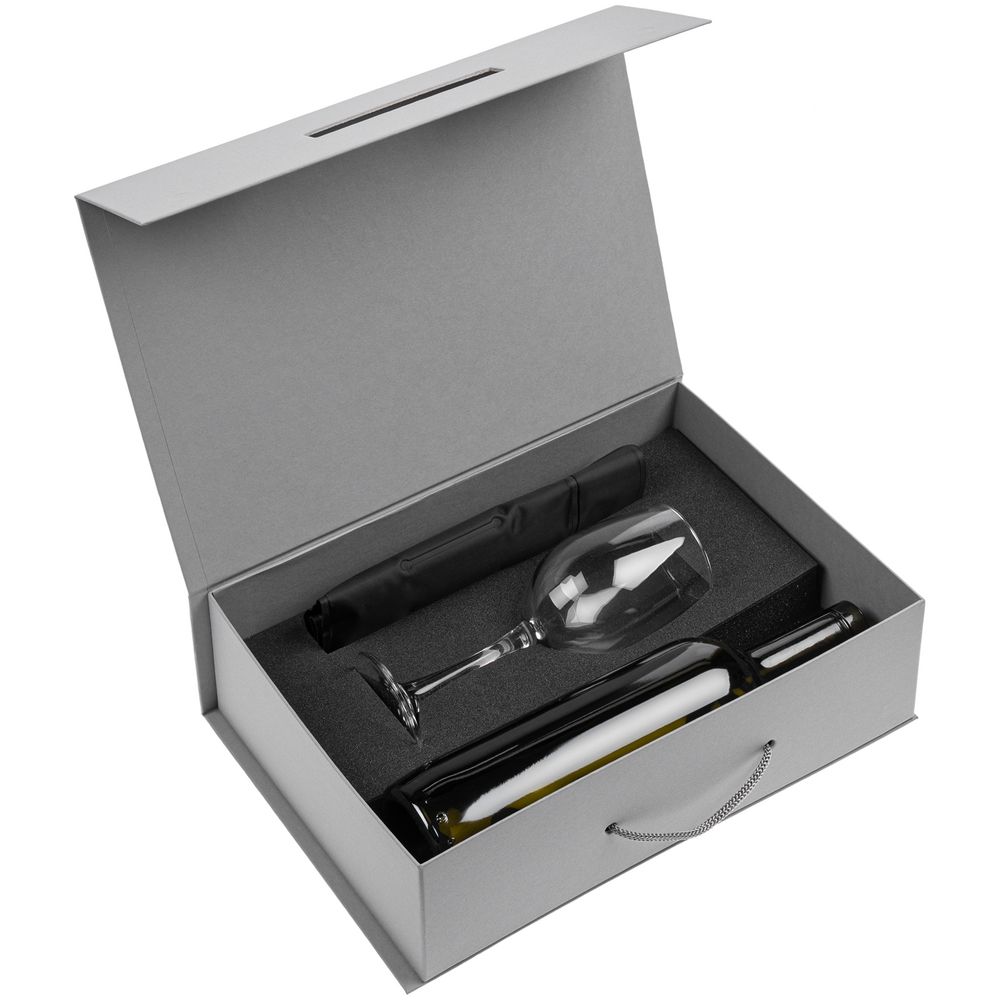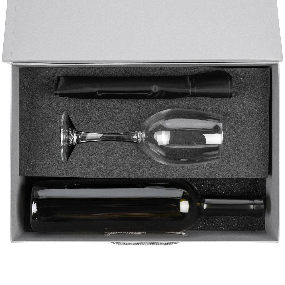 Бокал и охлаждающий рукав для бутылки — важные инструменты для правильной подачи вина. А вино можно выбрать на свой вкус: в коробке специально оставлено место для бутылки любимого алкогольного напитка.