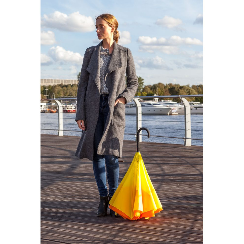 Это зонт-наоборот, зонт-наизнанку. Складываясь после дождя, он прячет мокрую поверхность в себя, а сухая остается снаружи. Для просушки его можно не только подвесить за ручку, как обычные зонты, но и поставить прямо на пол в полусложенном состоянии. Итог — мягкая щадящая просушка и минимум занятого мокрым зонтиком места.