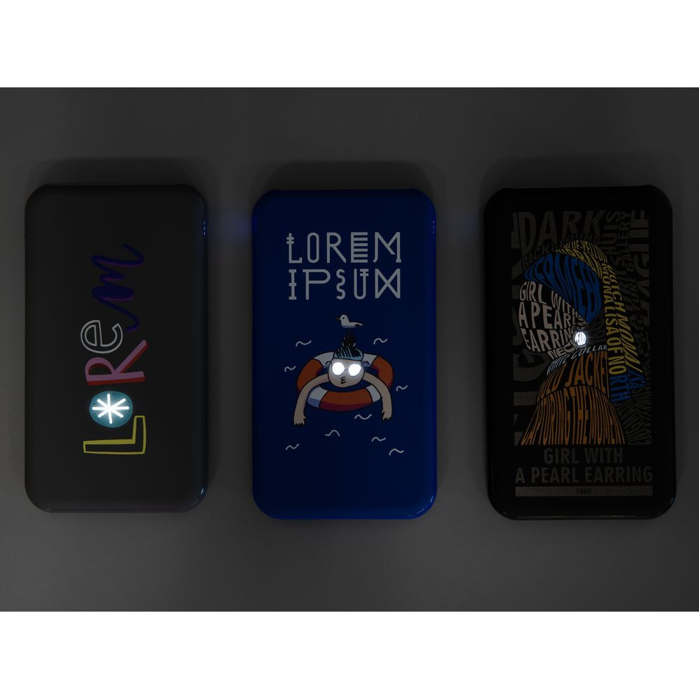 На лицевую поверхность может быть нанесено полноцветное изображение, а гравировка, хотя и будет одноцветной, сопровождается равномерной белой подсветкой. 120 секунд постоянного холодно-белого свечения при начале заряда смартфона, а также при начале и окончании заряда самого аккумулятора (или при нажатии на кнопку).